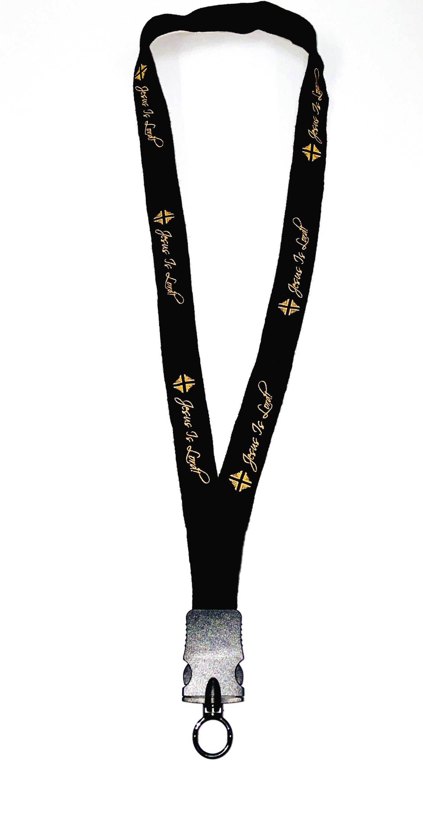 1/2" Cotton Lanyard with plastic snap buckle release and O-ring. O-ring can hold keys and badge clips Black with WHITE Jesus Is Lord! Print Also available in Burgundy with Gold Print and Black with Gold Print